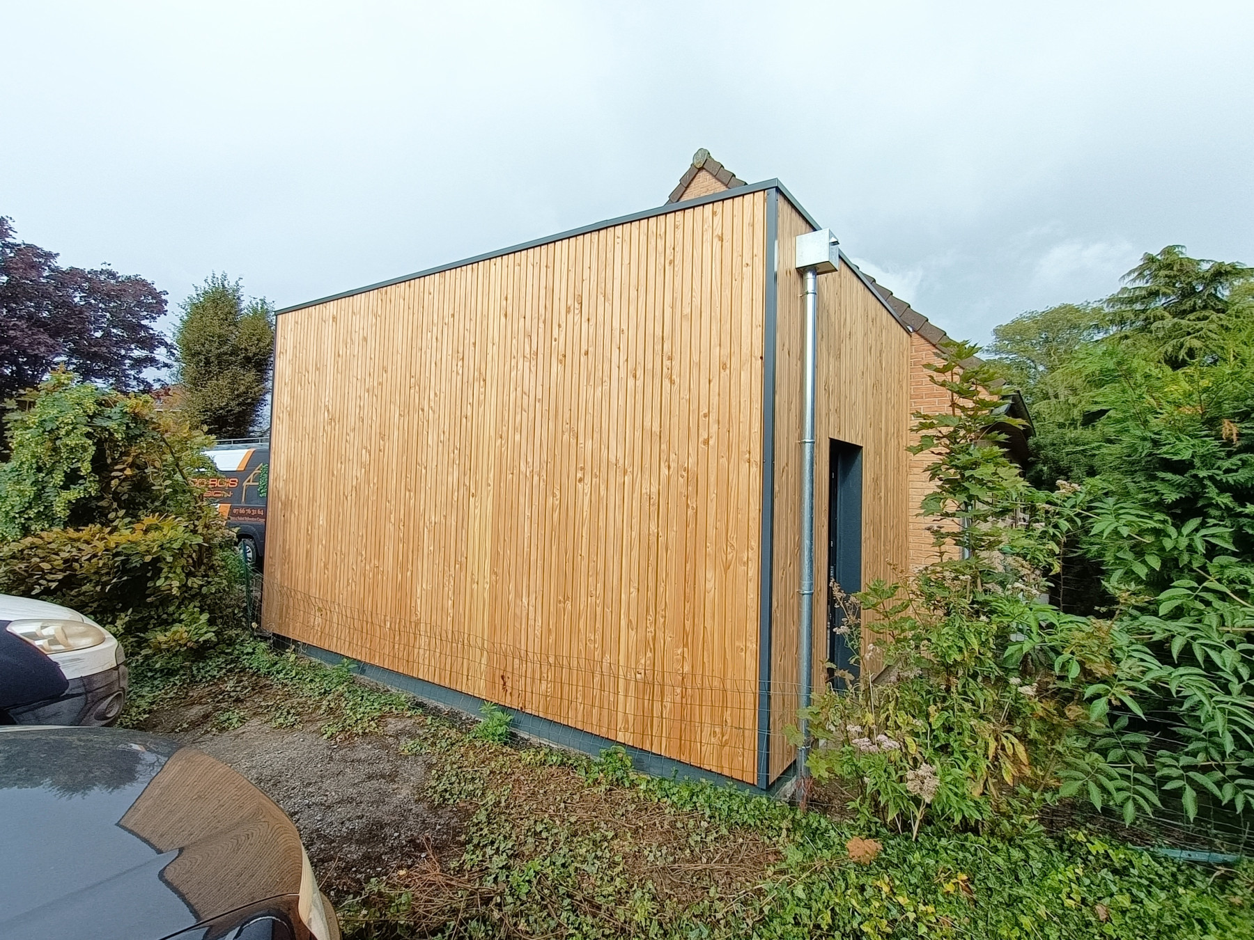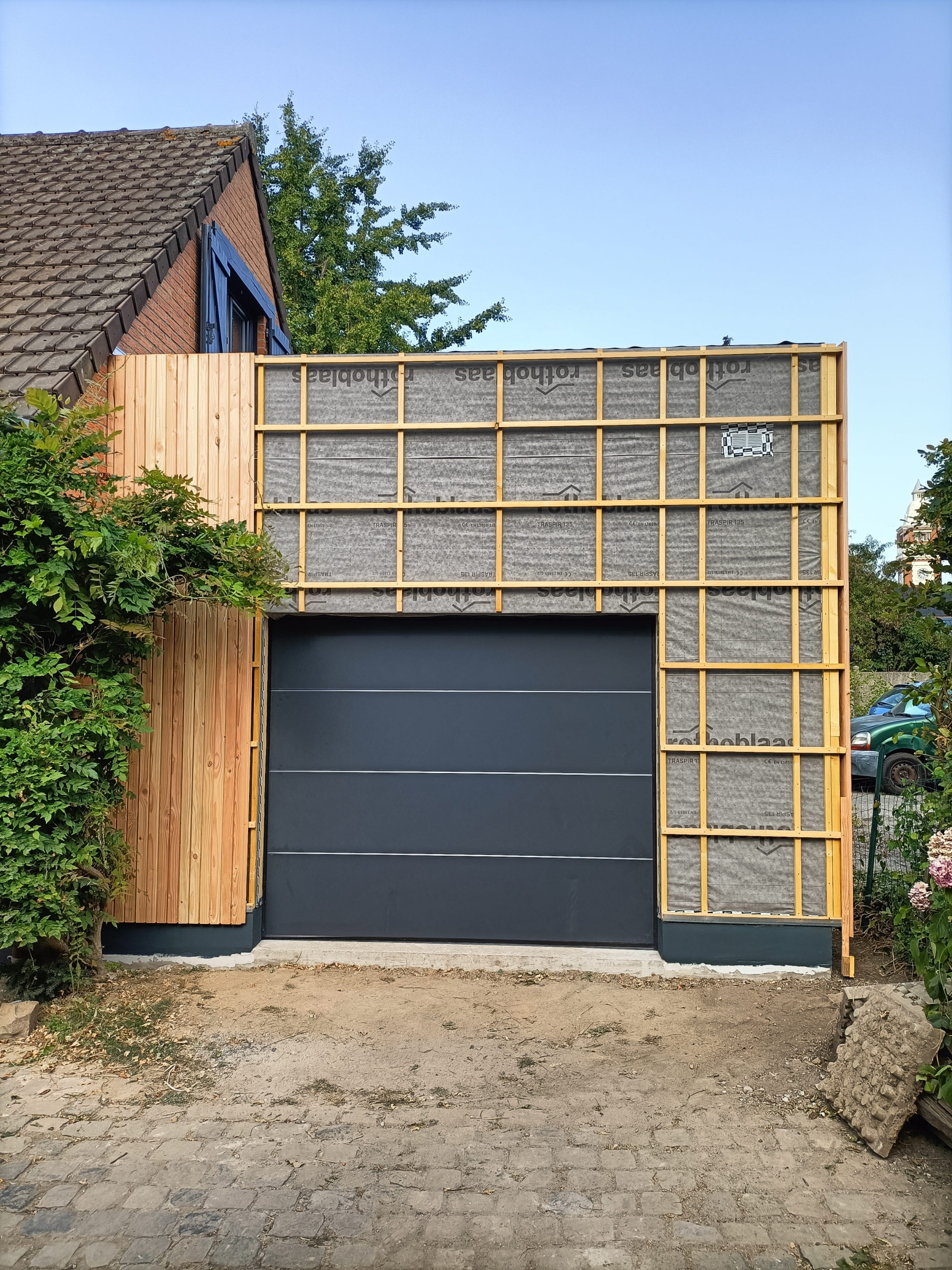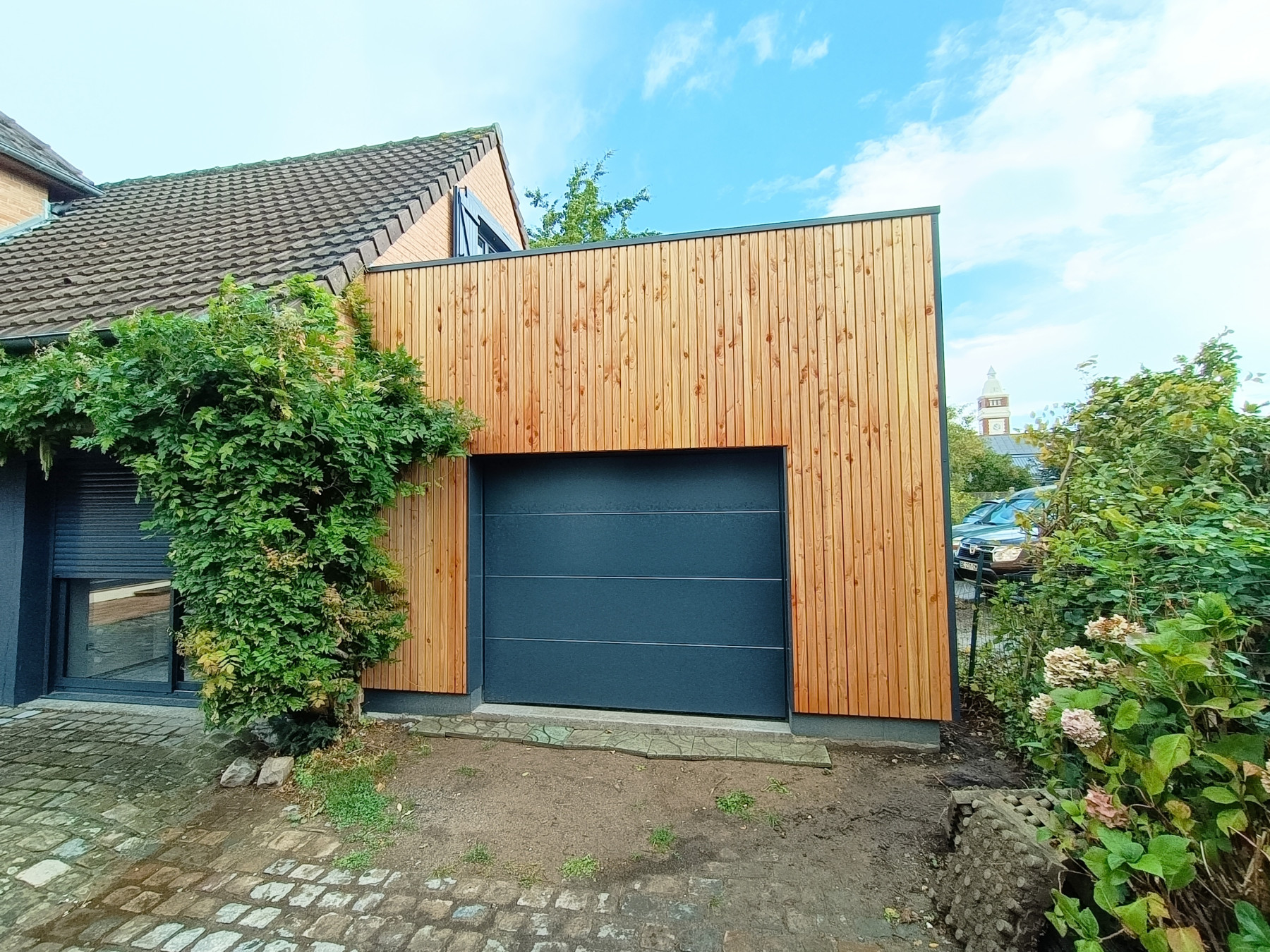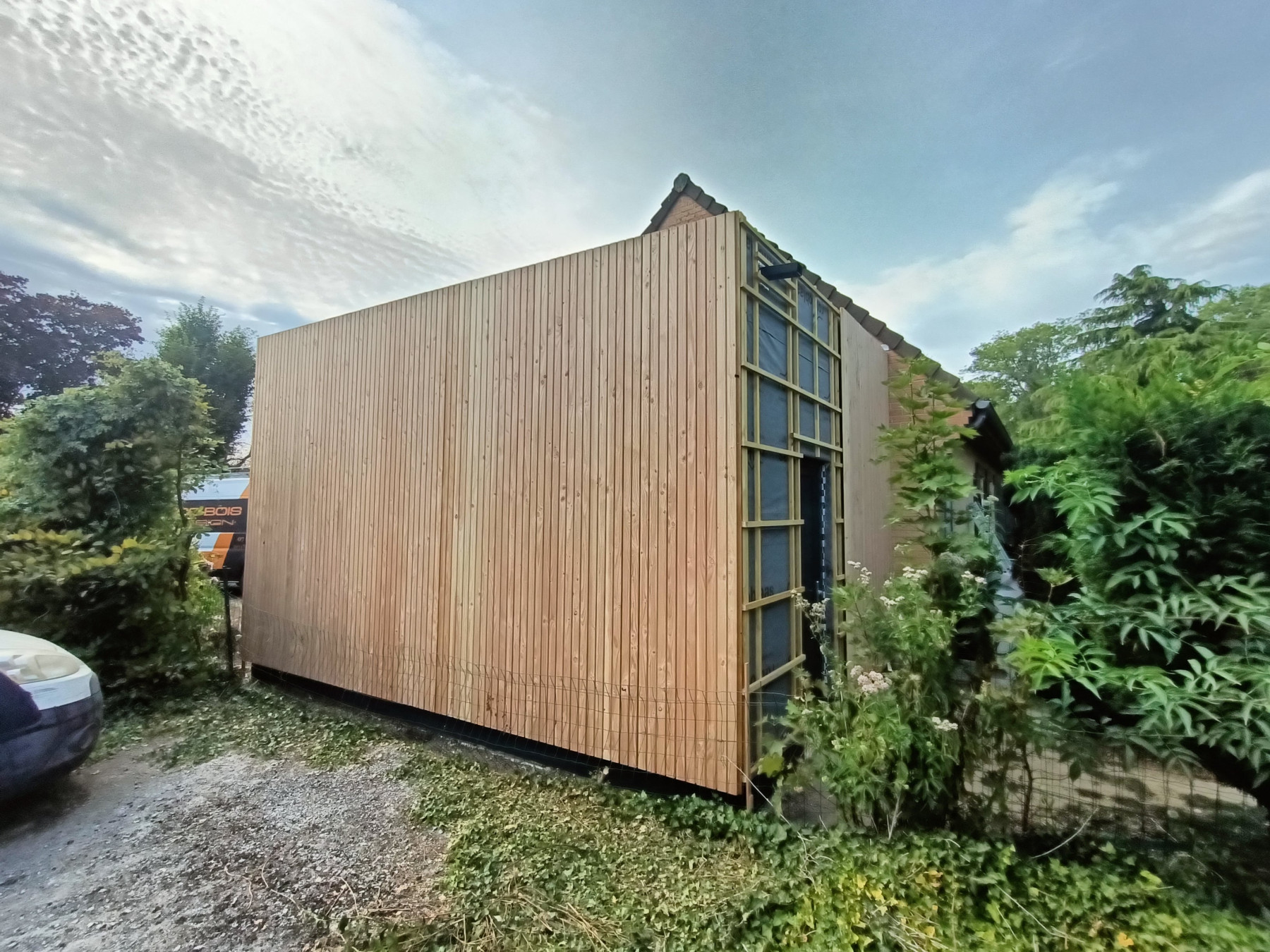 Garage en ossature bois avec bardage en faux claire voie naturel | Lesquin