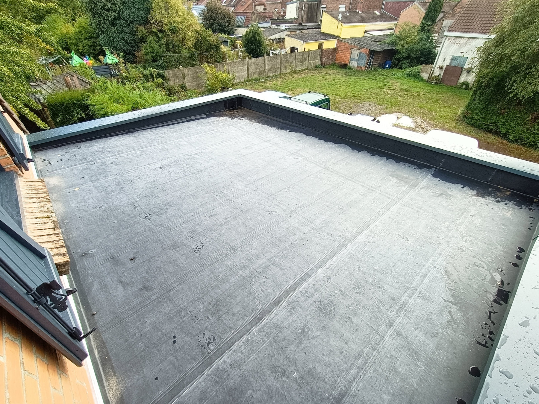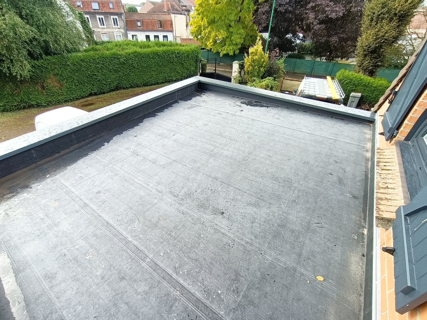 Très grand garage en Ossature bois avec toiture plate en EPDM et bardage en faux claire-voie naturel