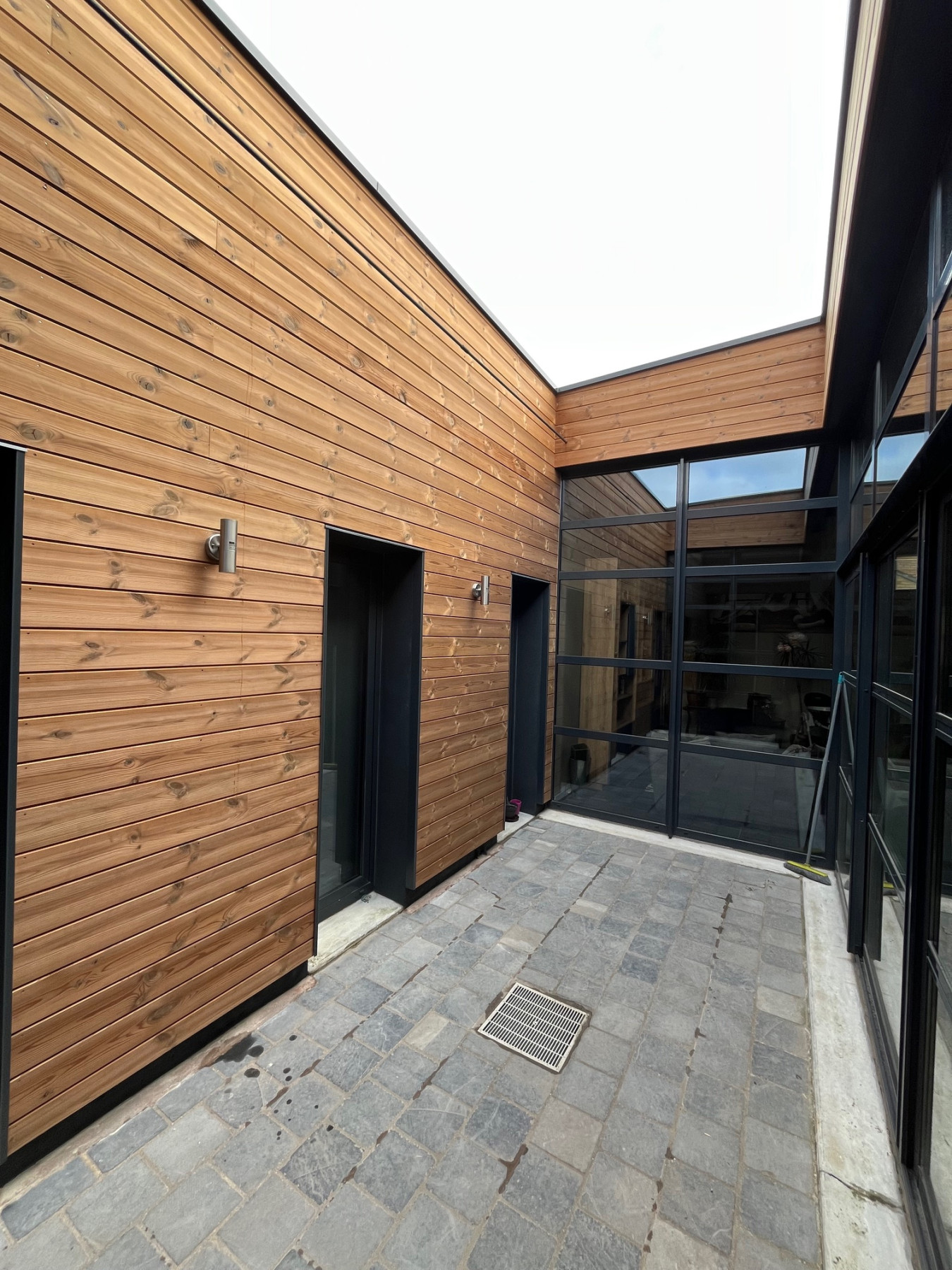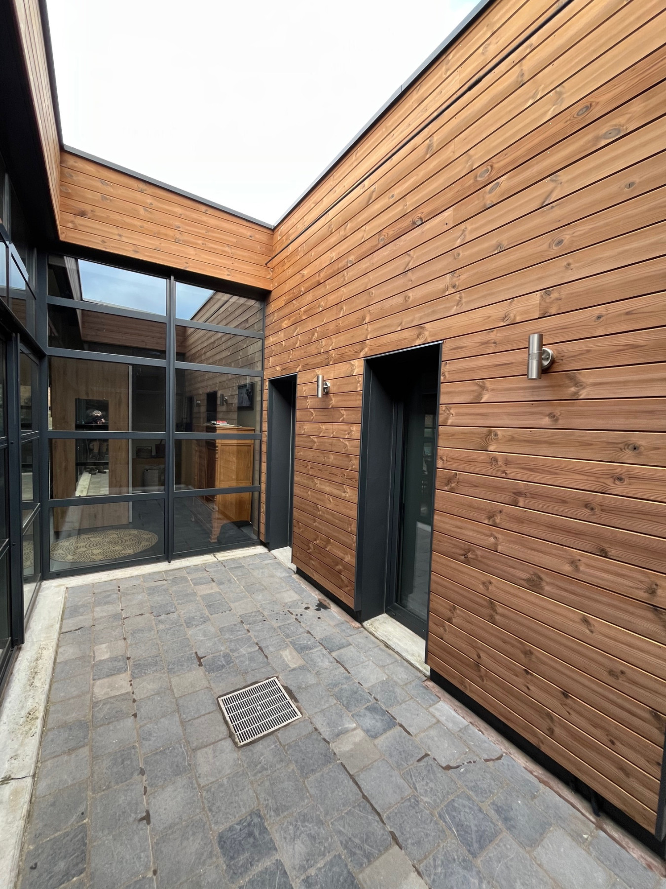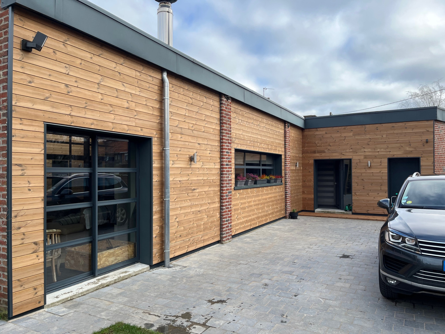 Rénovation complète d'un façade d'une maison et son patio par un bardage thermo chauffé.