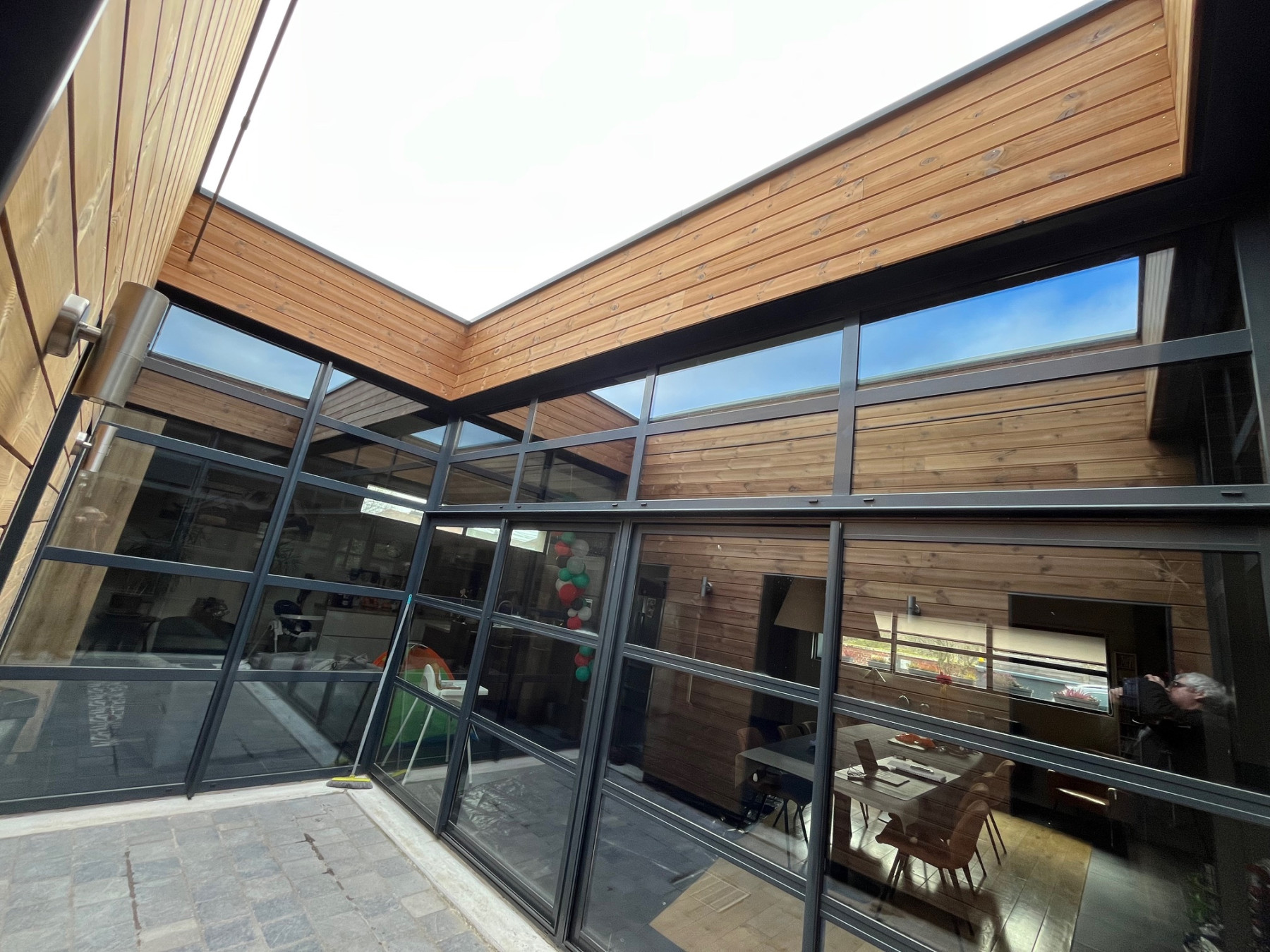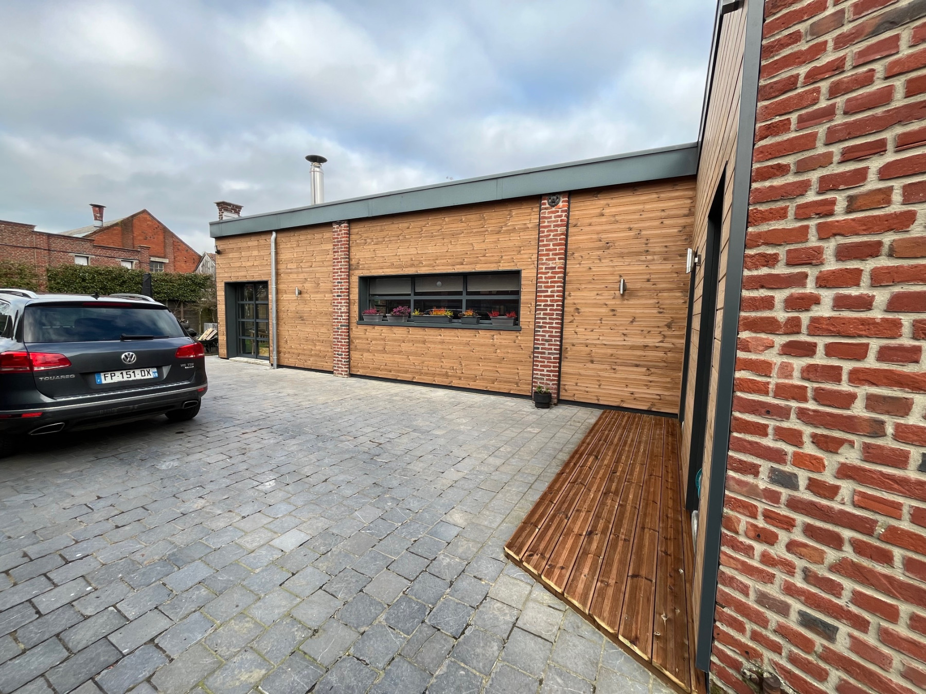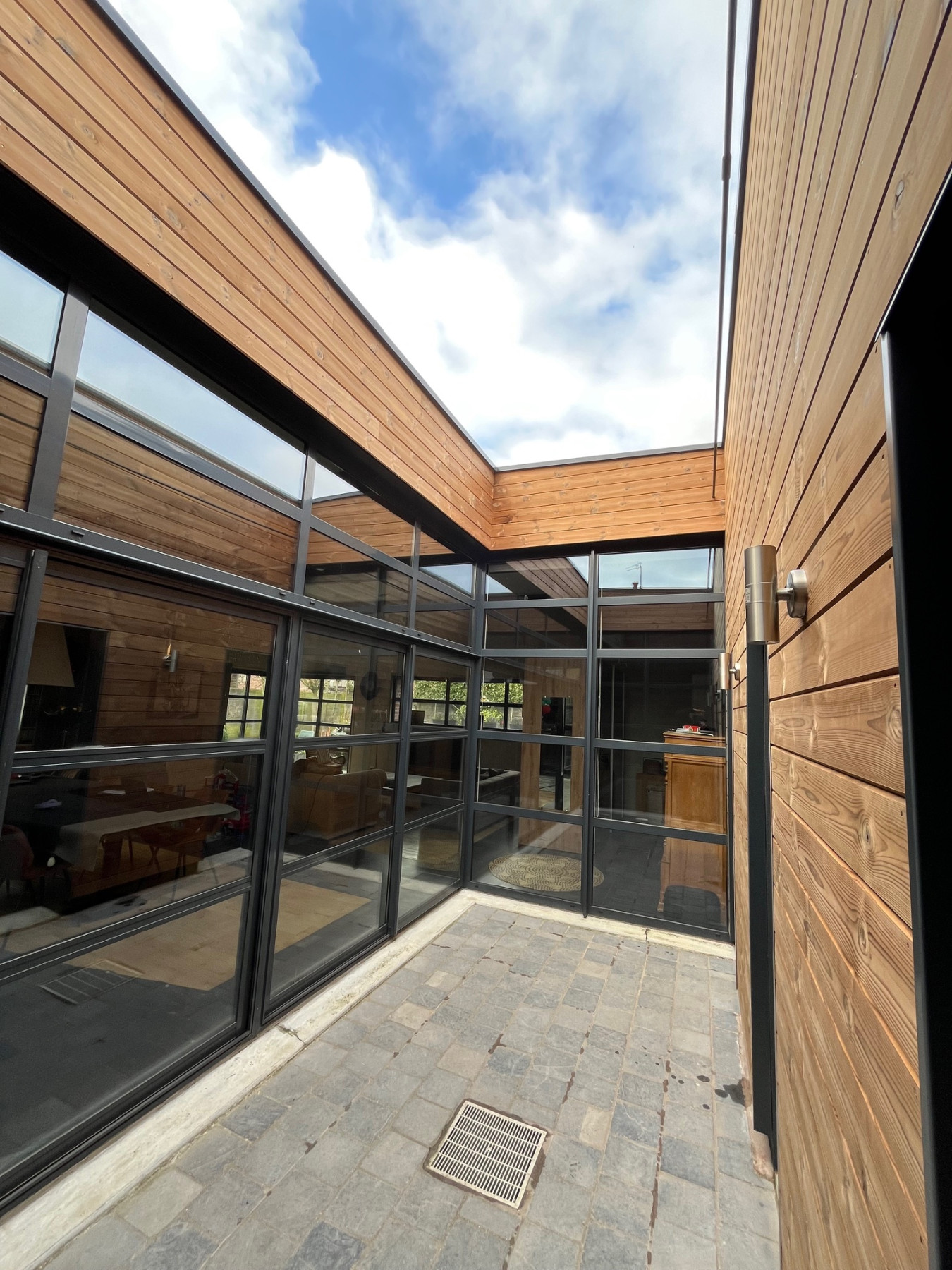 Rénovation complète d'un façade d'une maison et son patio par un bardage thermo chauffé.